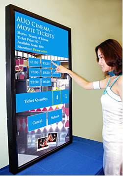 友达开发出的52吋触控面板除了用于广告牌外,更支持触控功能,增加互动性,以满足市场对公用讯息显示器的多样化需求。友达也同时开发出全系列2.4吋、3吋、3.53吋、4.3吋、5吋、6吋及12.1吋等尺寸的内嵌式多点触控面板,展现友达在内嵌式多点触碰技术深耕的实力。友达成功研发的电容感应式 (Charge Sensing)及压力感应式 (Voltage Sensing)两种内嵌式多点触碰技术都已进入量产阶段,拥有较高的穿透率及更好的抗炫效果,让屏幕即使在艳阳照射下亦能清晰显现。其中具备广视角特性的3寸LTPS触碰屏,拥有VGA(640 x 480)超高分辨率,面板厚度仅有2.7mm,是目前全球较薄的3寸触碰应用面板。友达的内嵌式多点触控面板是目前全球少数能直接将触控功能整合于面板前段制程的量产技术之一。