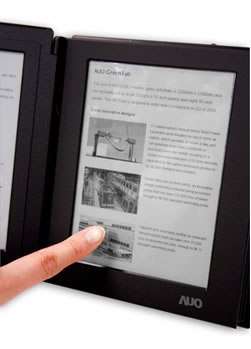 电子纸显示器近来逐渐成为热门的话题,由于具备纸张的视觉效果以及低耗电、轻薄、易携带与方便更换内容的特性,预计将刺激出版与印刷等相关产业转型以经营广大的数字内容市场,其涵盖的应用将可扩展至电子杂志、电子书、电子教科书与电子卷标,也将向彩色化、可挠式及提供触控功能等技术发展。友达积极布局电子纸显示技术有成,成功开发出6吋内建触控功能的电子书,采用Sipix独家的微杯(Microcup®)专利技术,拥有800X600高分辨率,及16层的高灰阶,加上高对比及高反射率,使其易读性大大提升,长期阅读也不容易疲惫。显示质量稳定,仅在更新画面时才需使用电力,是新一代更节能环保的商品。此技术拥有可为客户量身订制各种尺寸的优势,并在成本上更具竞争力,预计于今年内量产。