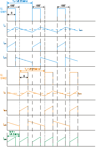 3. 180°异相操作导致的双相操作可以实现两倍高的有效开关频率(4.5MHz而不是2.25MHz)。