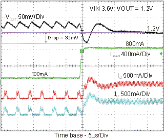 图6所示为单相位配置的负载瞬态响应的示波器曲线图,图7为双相配置。在两种情况下,施加了100mA至800mA的相同的负载阶跃,但是图6的DC/DC2处于禁用状态。在双相配置中,VOUT压降下降了一半,从而带来了绝对压降仅为30mV,而单相操作为70mV。两个转换器对输出的反应要比单个转换器操作更快,传输的电流更大。