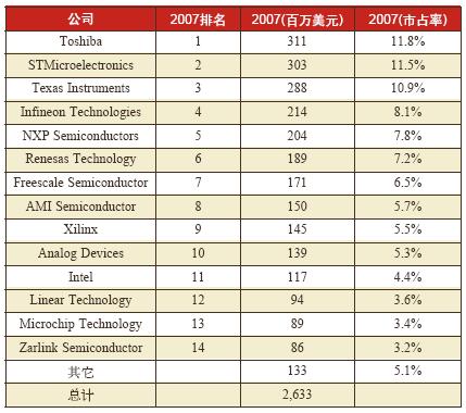 表1 2007年全球医疗半导体供应商的收入份额 来源:Databeans 2008年4月