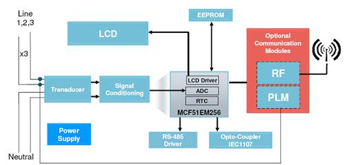 MCF51EM两个独立的闪存分区允许电表在一个Flash分区上运行,同时对另一个分区进行固件更新,以避免像以往那样需要停机更新所产生大量成本 |