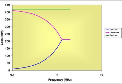 较高频率时,磁芯损耗开始限制容许铜线损耗,直到达到它们相等的点为止。在这一点上,通过增加更多匝数以及升高绕组电阻,使电感上升来降低通量。这样,电感额定电流减少。因此,从电感尺寸角度来说获得了较佳频率。