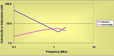 图1和图2均基于固定磁芯体积和绕组面积,仅匝数可变。图 2 显示了图 1 所示磁芯损耗的电感和容许直流电流。1.3 MHz以下时,电感与开关频率成反比关系。电感在1.3 MHz 附近达到较小值。该频率以上,则必须升高电感来限制磁芯通量,从而将磁芯损耗控制在总损耗的 50%。该电感的额定电流也同时被计算出来。低频率时,磁芯损耗并不大,额定电流由绕组的功率损耗决定。