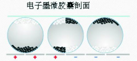 如图1所示为电子墨水微胶囊的剖面图,是利用在电压下能够改变黑白状态的微胶囊来实现图像显示的。圆圈表示组成电子墨水的透明颗粒,称为微胶囊,其直径只有人的头发丝的一半大小。电子油墨薄膜的顶部是一层透明材料,作为电极端使用;底部是电子油墨的另一个电极,微胶囊夹在这两个电极间。微胶囊受负电场作用时,白色颗粒带正电荷而移动到微胶囊顶部,相应位置显示为白色;黑色颗粒由于带负电荷而在电场力作用下到达微胶囊底部,使用者不能看到黑色。如果电场的作用方向相反,则显示效果也相反,即黑色显示,白色隐藏。可见,只要改变电场作用方向就能在显示黑色和白色间切换,白色部位对应于纸张的未着墨部分,而黑色则对应着纸张上的印刷图文部分。其特点是在反差、明亮度视觉等方面较理想,耗电低,重量轻而容易使其薄型化,形状自由等。另外,E-Ink公司的电子纸产品利用带电色粉的电泳现象,通过加大色粉的密集度来提高黑白反差。