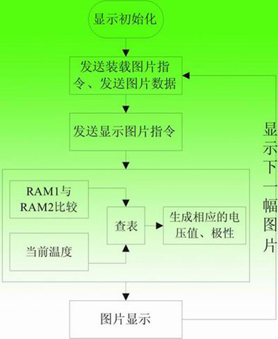 APOLLO驱动电子纸显示的操作流程如图4所示。电子纸的显示依据是要显示的图片与当前显示图片相比较,得出其差值,再根据当前温度查询对应的数据表格,依相应数据输出驱动。因此在上电后需对电子纸进行显示初始化,这样后续的图片显示就有较好的基准值。显示初始化后RAM1数据全置为1,第一幅图片数据存于RAM2,显示第一幅图片时将RAM2与RAM1进行比对,查表显示输出;第二幅图片数据存于RAM1,显示第二幅图片时将RAM1与RAM2(存储当前图片)进行比对,查表显示输出,RAM1即存储当前图片;下一幅要显示的图片存储于RAM2中,依次类推,循环执行即可输出要显示的画面。