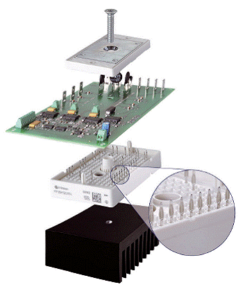 借鉴汽车行业广泛采用的做法,EconoPACKTM + D系列模块的控制管脚采用了极其可靠的PressFIT设计。用户可以直接将这种压接式管脚压入电路板,从而实现无焊无铅连接。但如果有必要,也可以将这种触点焊接到电路板上。因此,利用当前用于EconoPACKTM +模块的标准装配和焊接工艺,即可轻松处理全新推出的D系列模块。