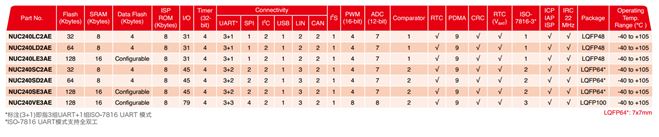 ESD/4KV EFT)、支持在线系统更新(ISP)、在线电路更新(ICP)与在线应用程序更新(IAP),提供封装有LQFP48/64与LQFP100。增强型NUC230/240系列可满足客户对控制器局域网络(Controller
