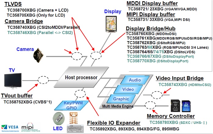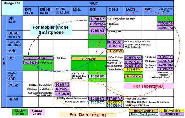 东芝推出了名为“移动外围器件(MPD)”的接口桥接芯片,可支持高速数据传输协议,比如 MIPI、LVDS、Display Port和HDMI。东芝的MPD不仅可以高速传输数据,也可以桥接主要的处理器和不同接口的外围设备。东芝也推出了广泛的外围设备产品组合,比如输入输出扩展器件和SC卡控制器等。