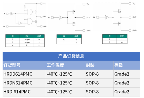 RDD614 被配置为带使能的非反相驱动器。HRDN614被配置为非反相驱动器,而HRDI614 被配置为反相驱动器。HRD_614系列用在8 引脚塑封表贴SOP 封装中。
