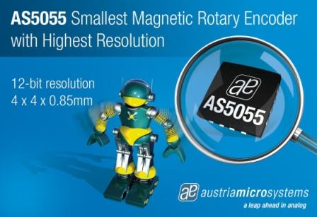 全球领先的通信、工业、医疗和汽车领域模拟集成电路设计者及制造商奥地利微电子公司(SWX 股票代码:AMS)今天宣布推出具有自动断电及唤醒模式的磁旋转编码器AS5055。AS5055主要适用于机器人等低功耗电池供电的应用,同时也适合需要小体积及高分辨率的其他位置检测应用。AS5055集成了4个霍尔传感元件、1个12位角度编码器、1个智能电源管理控制器和1个易于使用的3线或4线SPI通信接口。