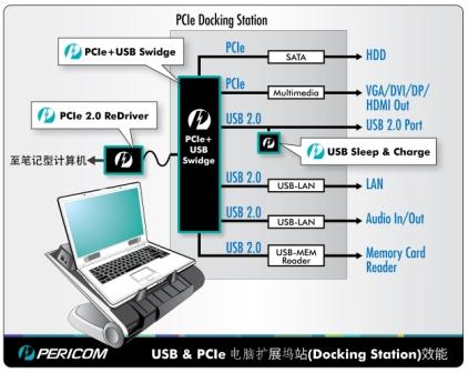 市场调研机构In-Stat 公司2008年3月的调查报告揭示:USB是现今较为广泛使用的串行通讯协议,拥有超过60亿的安装数量,在PC与周边产品中的采用率近乎100%,并以每年20亿个单位以上的数量增长;并且在PCIe to USB2 + PCIe Swidge和Sleep-and-Charge产品所涉及的细分市场中获得广泛的应用。另外单通道的PCIe 2.0 ReDriver是针对量产化的笔记本电脑扩展坞(docking station)、外接线缆(cable)和其它应用,在这些市场中多通道产品的性价比不高。