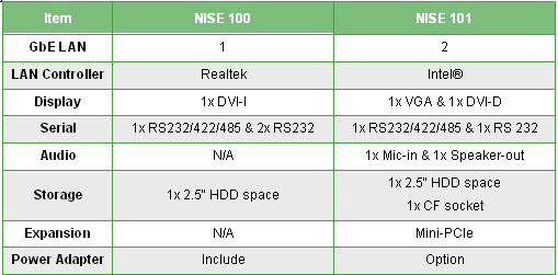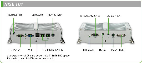 NISE 101 无风扇PC 是超薄,无风扇,工业等级的系统,机箱尺寸仅为185mm(W) x 132mm(D) x 54mm(H) 。 基于Intel® Atom™-based N270 1.6GHZ 处理器和945GSE 嵌入式套片组, NISE 101 无风扇PC是一个轻量极,高效能的解决方案,同时兼备性能和可靠性,因此拥有工业等级不间断系统的运行能力。