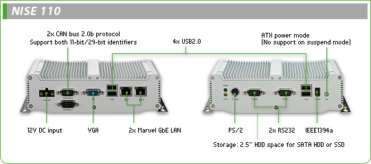 NISE 110 无风扇PC拥有2x CAN Bus 2.0b和2x RS232接口, 超小尺寸仅手掌大小的无风扇机箱, 尺寸为185mm (W) x 131mm (D) x 54mm (H)。紧凑尺寸的设计使 NISE 110 无风扇PC 成为空间限制环境应用及嵌入工业自动化设备应用的较佳解决方案。基于Intel® Tolapai EP80579高集成处理器, NISE 110 无风扇PC提供的2个CAN bus (2.0b protocol) 接口作为实时控制应用,可以同时支持11 bit 和 29 bit 标识符,速率可达1Mbps (40MHz 时钟频率)。