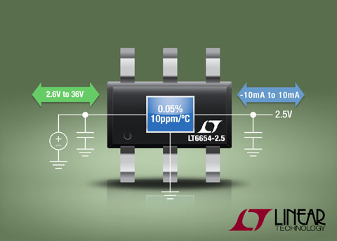 加利福尼亚州米尔皮塔斯 (MILPITAS, CA) – 2010 年 8 月 12 日 – 凌力尔特公司 (Linear Technology Corporation) 推出 SOT23 封装的串联电压基准 LT6654,该器件专门为在 -40°C 至 125°C 的温度范围内准确工作而设计。这个电压基准兼有 0.05% 初始准确度、10ppm 温度漂移和仅为 1.6ppm 的低频噪声。LT6654 可在比输出仅高 100mV 的电源上工作,而且在电源电压高达 36V 时保持仅为 5ppm/V 的电压调节误差。缓冲输出实现高达 10mA 的供应或吸收能力,而且将负载调节误差限制到仅为 8ppm/mA。此外,吸收功能允许 LT6654 作为负电压基准工作,而不会损害准确度。先进的设计、工艺和封装技术确保长期稳定性、以及在 -40°C 至 125°C 的整个温度范围内确保低的热迟滞。