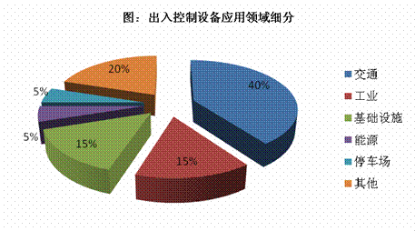 出入口控制设备的应用主要集中于工业、交通及基础设施领域;民用相对较少,仅仅处于起步阶段。根据Frost & Sullivan公司的研究,交通领域为2009年出入控制产品需求较大的行业,需求量超过整体高端市场的40%,其次是工业领域和基础设施建设各占15%左右。