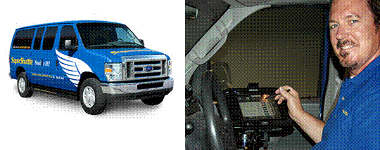 移动车载平板PC, MRC 2100, 装备 GSM, GPRS, HSDPA, WCDMA Wi-Fi 和 Bluetooth功能,因此 SuperShuttle的司机可以随时取得联系,在他们去任何地方的时候。接机位置的更新是和个人预订信息的保留是实时连机的。随同空间导航工具包 Telogis Geobase提供的功能,系统可以及时自动优化路线。