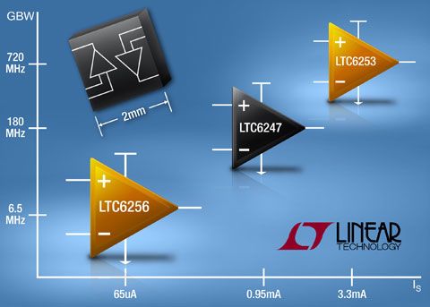 加利福尼亚州米尔皮塔斯 (MILPITAS, CA) – 2010 年 8 月 25 日 – 凌力尔特公司 (Linear Technology Corporation) 推出单 / 双 / 四路轨至轨运算放大器 LTC6252/3/4 和 LTC6255/6/7,这些器件采用纤巧封装,提供了无与伦比的速度-电源效率。LTC6252/3/4 实现了 720MHz 增益带宽 (GBW) 积和 280V/us 转换率,同时仅消耗 3.3mA 电源电流。LTC6255/6/7 提供 6.5MHz 增益带宽积和 1.8V/us 转换率,仅消耗 65uA 电源电流。这些器件与之前推出的 180MHz 增益带宽积 1mA 电源电流的 LTC6246/7/8 结合,就提供了一个适合于多种应用的高效率运放系列。