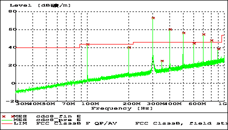 由于两个原因,时钟信号常归咎于 EMI。即使时钟低频率运行,较好的时钟上升/下降沿也包含大量的奇次谐波,其在更高频率时会引起 EMI。另外,时钟通常会在板上传播一段较长的距离,从而更可能给其他组件带来干扰。通常,EMI 可通过频谱分析仪测量,如图 1 所示。图中,绿色信号存在一些超出红色 FCC 屏蔽的频率分量(300MHz、400MHz 和 500MHz 等)。