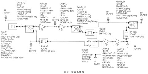 仿真设计中采用一个输出功率约80 W的LDMOS功率管作为仿真的基础器件,着重仿真在一定的功率回退基础上,误差放大器的增益漂移对整个前馈电路的影响。并根据仿真结果得出在预期的交调失真抑制目标下,该误差放大器可以承受的增益改变。为了简化仿真过程,在仿真中忽略了功率管等器件的插入相位问题。图2,图3为基本的仿真电路图及仿真结果,从结果中可以看出,在合适的耦合因子和增益下,前馈可以较好地改善交调抑制结果。