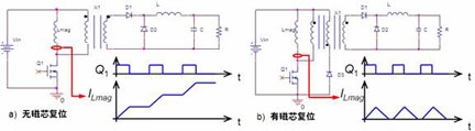图1:正激转换器不带磁芯复位与带磁芯复位之对比。