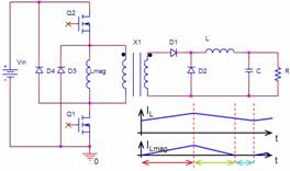 单开关(或称单晶体管)正激转换器是一种较基本类型的基于变压器的隔离降压转换器,广泛用于需要大降压比的应用。这种转换器的优点包括只需单颗接地参考晶体管,及非脉冲输出电流减小输出电容的均方根纹波电流含量等。但这种转换器的功率能力小于半桥或全桥拓扑结构,且变压器需要磁芯复位,使这种转换器的较大占空比限制在约50%。此外,金属氧化物半导体场效应管(MOSFET)开关的漏电压变化达输入电压的两倍或更多,使这种拓扑结构较难于用在较高输入电压的应用。