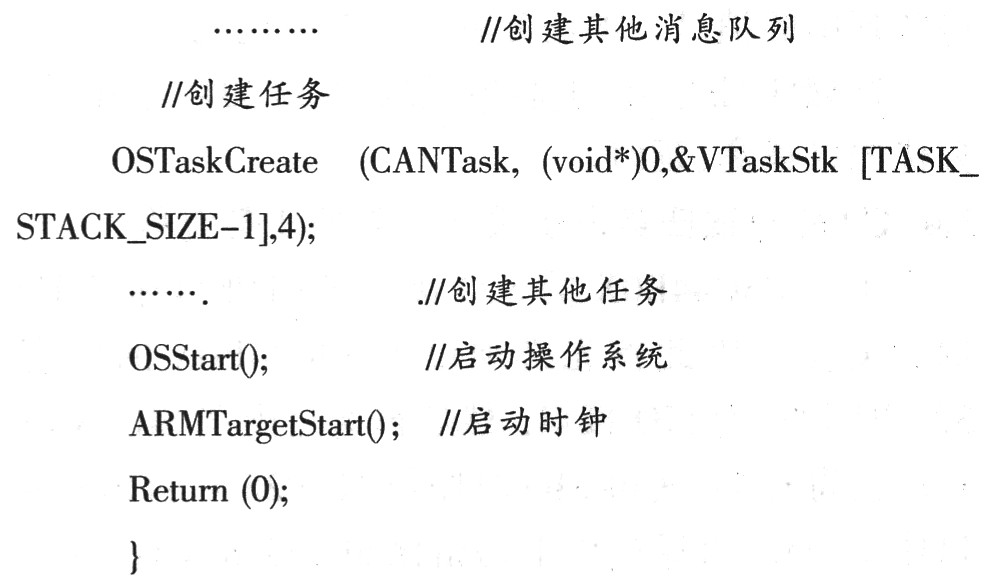 对一个具体的嵌入式应用系统“任务划分”是实时操作系统应用软件的关键,任务划分是否合理将直接影响软件设计质量。本系统主要有8个任务,即车速脉冲测量任务、CAN总线任务、水温采样任务、油量采样任务、开关量处理任务、里程记录及LCD显示任务、步进电机驱动任务、WDT任务。任务间通过消息队列和信号量进行通信和共享数据。系统主控程序如下: