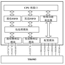 - 包处理模块:用硬件实现数据链路层部分功能。发送模式下,添加可变字节的前导码,3位的界定符,1个字节的帧长,可选的前向纠错编码,2个字节CRC16校验这些数据作为MAC层负载;接收模式下,包处理模块完成对数据包的解包,主要工作为前导码的检测,界定符的检测,可选的1个字节地址比较,2个字节的CRC16校验。
