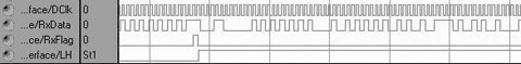 配置TR6903模式下仿真波形如所图 4示,以串行方式向TR6903写入6个字节的配置,改变TR6903工作频率,实现跳频。此时在ConfigClock的上升沿时从ConfigData送出10110010,00111010,01010110,00111010,10101010,10110010数据。Strobe为高时,ConfigClock停止。发送物理层帧部分仿真波形如图 5所示,以串行方式向TR6903发送物理层的帧。此时,先送出32位的0101…0101同步码,3个位的界字符111(TR6903检测到3个时钟周期以上的高电平),后面紧接是帧长及物理层负载。接收物理层帧部分仿真波形如图 6所示。TR6903在界定符发送完毕的较后一位,送出1个时钟周期高电平RxFlag信号;基带处理模块检测有效高电平,作为有效数据帧的开始,同时基带处理模块从LH引脚输出高电平,来响应TR6903。