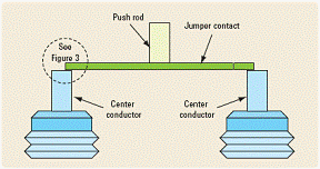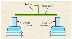 传统的开关通过移动射频罩中称为搭接片触点(或开关闸刀)的厚矩形触点完成开关切换。搭接片触点与推杆相连。推杆通常由绝缘体材料如聚苯乙烯(PS)制成,在射频罩出入孔内移动。搭接片触点的端头受到调节器的机械弹力,直接压在连接器中心导体端头的平坦表面上。