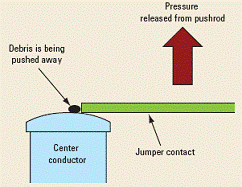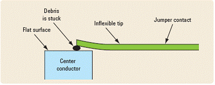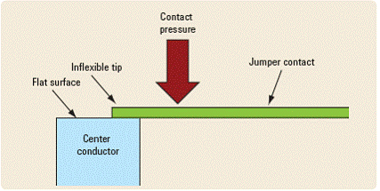 尽管这种设计能够使机械驱动装置的寿命达到几千万次,但仍有许多严重缺陷。搭接片触点和中心导体之间的连续碰撞将会逐渐造成越来越大的磨损,并产生一些碎屑。这些碎屑以及长期积累的灰尘和污染物会一起留在端头上。结果,随着时间的延长,接触电阻将会增加,从而使得插入损耗增加。这不一定会导致开关达不到其射频技术指标,但随着时间的增加,将会对插入损耗可重复性产生巨大影响。在开关的整个寿命期内,这些微粒会在中心导体的表面上不断堆积,其随机性意味着这种故障可能时断时续,无法被检测出来。导致这种不利结果的罪魁祸首正是没有弹性的搭接片触点设计。因此,具有这种设计特性的开关达不到可重复性技术指标或者根本没有可重复性是很常见的事情。