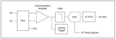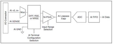 由于使用了多路复用器,在每个模拟输入(AI)通道被采样之后都会出现一个小小的延迟。这对于大多数应用而言是可以接受的,但是一些应用需要保持模拟输入之间的相位关系。