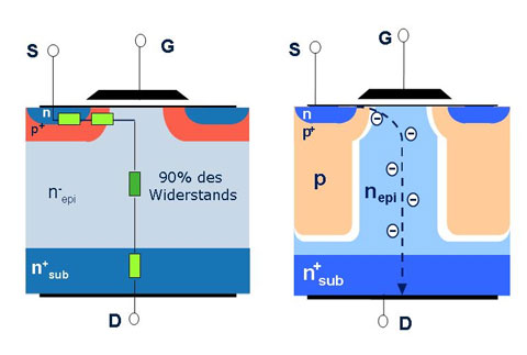 图1:传统高压MOSFET(左)与电荷补偿或超结器件(右)的结构比较