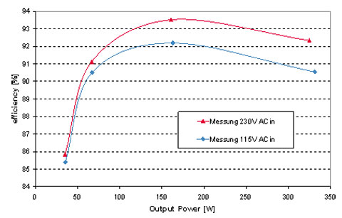 图5:300W PC开关式电源在线电压分别为115V AC和230V AC时的实测效率比较