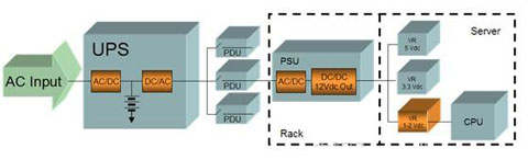 在美国,供电网把大约13,800 Vac的交流电配送到各个社区,较后利用变压器(不对能耗产生显著影响)将电压降为480 Vac。而每个数据中心都几乎都备有一个UPS(不间断电源),一般是双转换在线UPS,它可以通过被整流的AC供电主干线或电池连续产生新的无干扰正弦波输出,故没有中断开关。可是,这个功率调节级的效率可能只有70%。