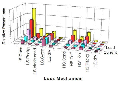在DC-DC转换器应用中,重负载条件下,因传导损耗,效率主要由导通阻抗决定;而在轻负载条件下,则控制效率的主要因素是栅极电荷、反向恢复电荷和输出电容。下图显示了不同输出负载条件下,各个元件的相对功耗。