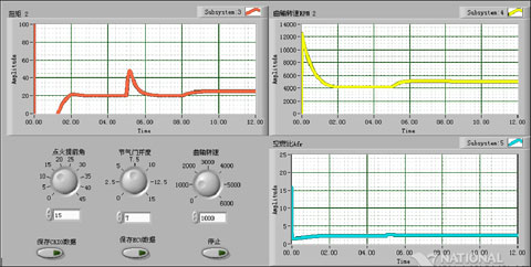 构建了基于PXI的发动机ECU快速原型和在环仿真系统。系统能输出温度等模拟信号、采集电压等模拟信号,输出或测量开关等数字信号,喷油脉宽、点火脉冲等PWM信号采集,以及曲轴、凸轮轴位置等定时脉冲信号的输出。设计了标定实验,联合万能表、示波器对系统进行误差对比分析, 进行了基于CompactRIO(简称CRIO)的ECU快速原型和真实ECU在环测试。