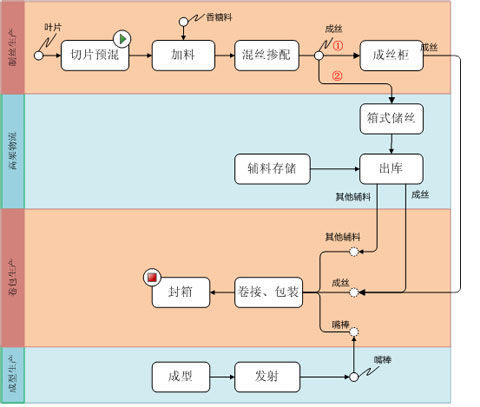在MES系统中,一方面是应用功能的规划和部署,另一方面是数据点(集控系统标签点)的规划和数据采集算法,龙岩卷烟厂制造流程简化模型如下图所示,图中箱式储丝为精品线的创新,即成丝由氮气封装后直接上物流高架库存储。