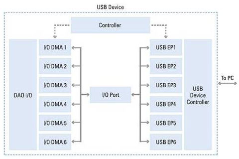 图3 每一个数据采集I/O端口的DMA通道都会以高吞吐量与USB接口终端间进行数据收发