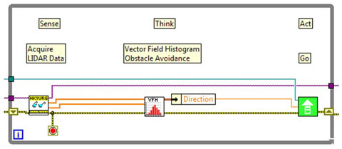 图4 机器人设计软件应该是非常直观的。LabVIEW图形化编程通过直观的框图和连线完成了LIDAR数据采集、障碍物回避决策、刹车制动等三个步骤,清晰易读(有文字的淡黄色部分为程序注释)
