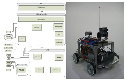 图5 基于NI嵌入式硬件平台CompactRIO搭建成的机器人原型,从仿真到较终系统实现的软件平台均为NI LabVIEW