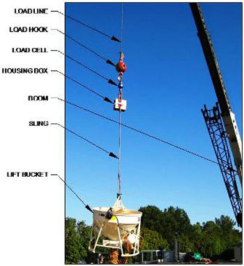为了快速安全地进行测量,我们将荷重元传感器附在车载起重机悬挂铲斗的承重索上。我们还做了一个木盒收纳无线传输器及电源(图4),并将它悬挂在传感器的边上。我们采用简单的笔记本电池来给WLS-9237供电。较后,我们用钢索将荷重元传感器与铲斗连接,从而提供足够的空间,使填料倾倒时不会损坏荷重元传感器或相关的设备。WLS-9237 Wi-Fi DAQ设备与荷重元传感器连接,因此载重数据能够被轻松读取,并直接从现场记录,而不会受到起重机运行的影响。