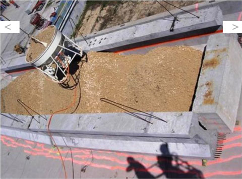 我们通过在桥面上放置箱式结构的混凝土梁来模拟车辆载重,并通过在桥上加载倾倒物来增加重量(图3)。路基因其易于获得、低成本及较高密度被选择作为填料。