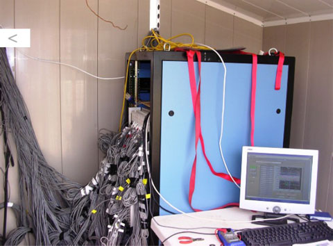 所有硬件来自美国国家仪器公司(NI),包括 244通道的DAQ设备(图5)。两台NI SCXI-1001 12槽机箱内安装了24块 NI SCXI-1520 8通道通用应力模块。我们还使用了两台NI SCXI-1000 4槽机箱,其中插入了5块NI SCXI-1520 8通道通用应力模块和3块NI SCXI-1121 4通道隔离放大器。NI SCXI-1314 8通道接线端模块与所有29块NI SCXI-1520模块连接,3块NI SCXI-1321 4通道接线端模块与NI SCXI-1121隔离放大器连接。所有4个机箱都通过NI PCI-6250 DAQ板与PC连接,我们使用LabVIEW对其进行配置。