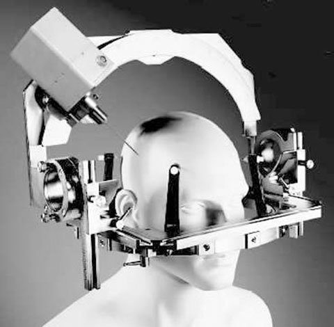 以前,外科医生必须通过定位被称为立体定向头盔的金属结构上的设备,进行PRS系统的手动控制(如图1)。发射探头通过齿条传动穿过颅腔。金属结构作为定位神经外科手术仪器的三维参考。然而,人工控制不能提供较高的定位精度,并且其功效在PRS系统应用中仅局限于并不多见的球形肿瘤。