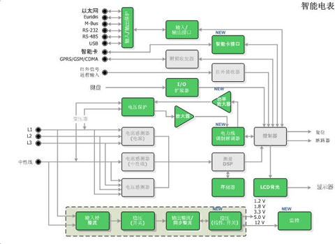 安森美半导体应用于智能电表的方案包含一系列标准产品、专用标准产品(ASSP)及专用集成电路(ASIC),可以提供智能电表的4种基本功能,包括:电源/电源管理、计量、寄存及通信,具体产品包括功率因数控制器、交流-直流(AC-DC)控制器、直流-直流(DC-DC)控制器、稳压器,MOSFET、整流器、三端双向可控硅开关元件(TRIAC),PLC调制解调器、线路驱动器及信号放大器,滤波、输入/输出(I/O)及数据保护,LCD背光驱动器,EEPROM存储器,及智能卡接口等。图2是由安森美半导体的多种器件(图中绿色部分)构成的智能电表应用。