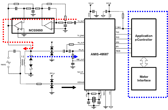 蓝色箭头表示接收路径。变压器从电力线耦合过来的信号经AMIS-49587内置放大器构成的低通滤波器由内部ARM进行FSK解调分析。图中黑色箭头是50 Hz的过零检测信号引脚。系统依靠这个信号进行同步定时。图中蓝色虚线内是电表内的应用处理器,负责应用层处理通信及计量。