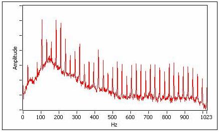 旋转机械的运行一般有两种状态:旋转机械运行在一个恒定转速下。这种状态下,旋转引起的对整个机械结构的振动激励可以被视为有着离散频谱的多个谐波组成激 励信号,相应的结构振动响应信号的频谱也是多个谐波构成的离散谱。如图 1所示。另一种是旋转机械运行在升速或降速过程。这种状态下,旋转引起的振动激励可以被视为通过某个频率范围的宽频带扫频激励信号,相应的结构振动响应信 号的频谱是宽频带响应谱,如图 2所示。