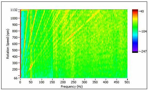 图 7 旋转机械升速过程转速-频率谱图