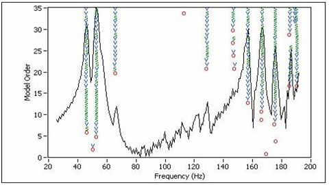 获得旋转机械结构每个测量点的工作状态FRF后,就可以使用频率域模态参数估计方法来提取结构的模态参数。在模态估计环节,采用了ModalVIEW中较小二乘复频域的方法。获得的模态稳定图如图 10所示